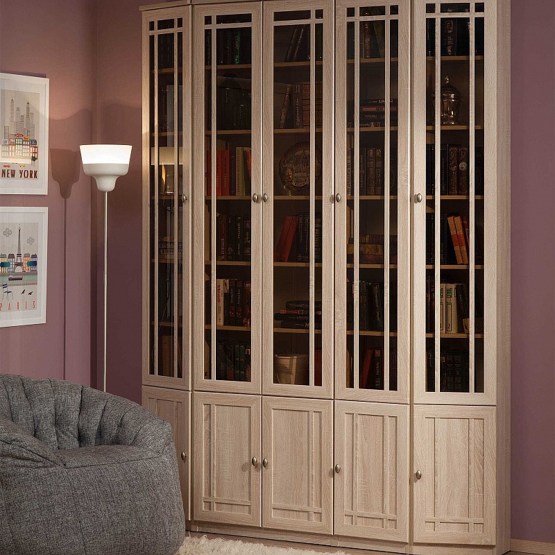 Высокий книжный шкаф можно установить в комнату с высотой потолка не менее 240 см. Высота полок во всех шкафах для книг регулируется, для этого только необходимо установить полкодержатели в подготовленные отверстия. Это позволит поставить на полки книги и альбомы разного формата. Тонированное стекло защищает книги от вредного воздействия солнечных лучей и убережет их от пожелтения.  Книжный шкаф обязательно крепится к стене за подвесы и межсекционной стяжкой с другими шкафами в наборе. Библиотека выпускается без выборки под плинтус, чтобы каждый мог прирезать плинтус индивидуально. В противном случае остаются неаккуратные зазоры между модулем и стеной.