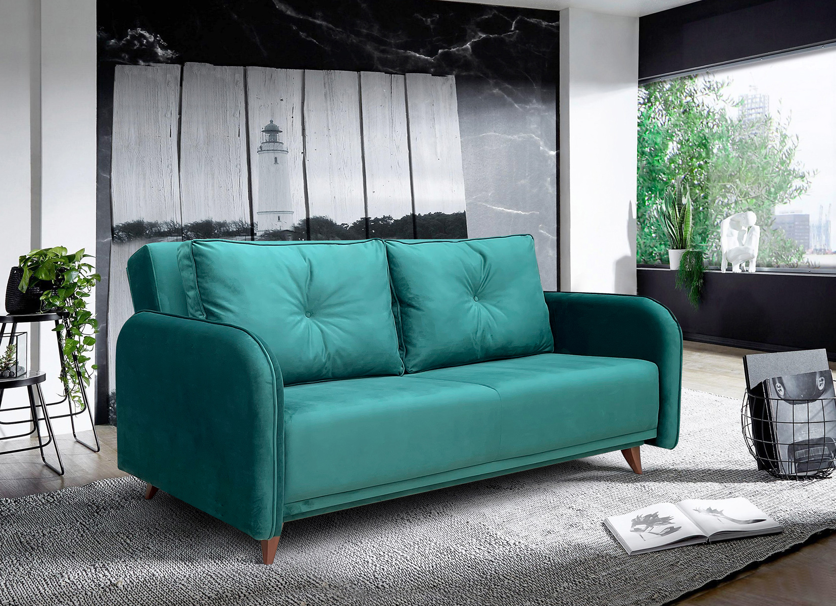 Диван в духе неоклассицизма, с различными вариантами подлокотников, отделки строчек и пуговиц, а также высокими ножками.