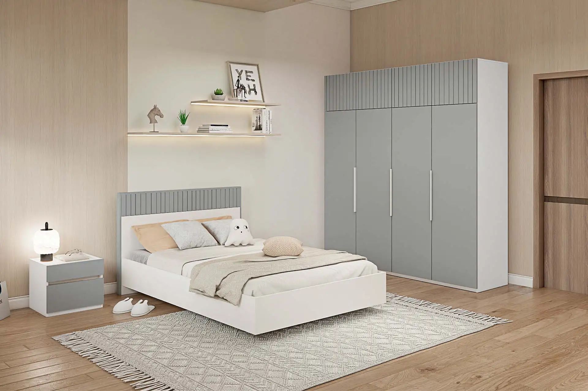 Распашной четырехстворчатый шкаф с функциональной шириной 2000 оснащен штангами, полками и выдвижными ящиками. Фасады МДФ в цвете Лайт Грей Софт и антресоли с фрезеровкой придадут особый шарм любому интерьеру.