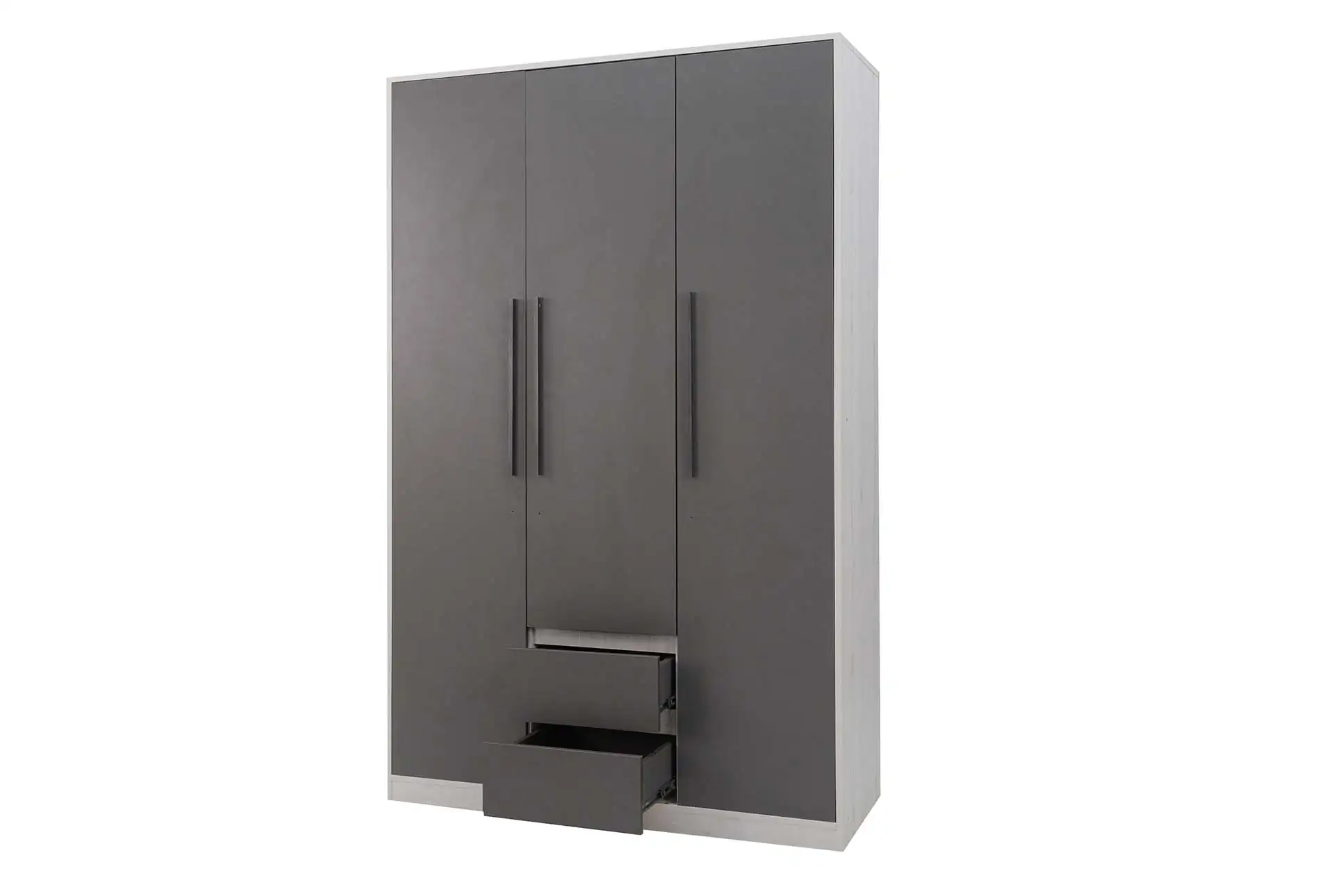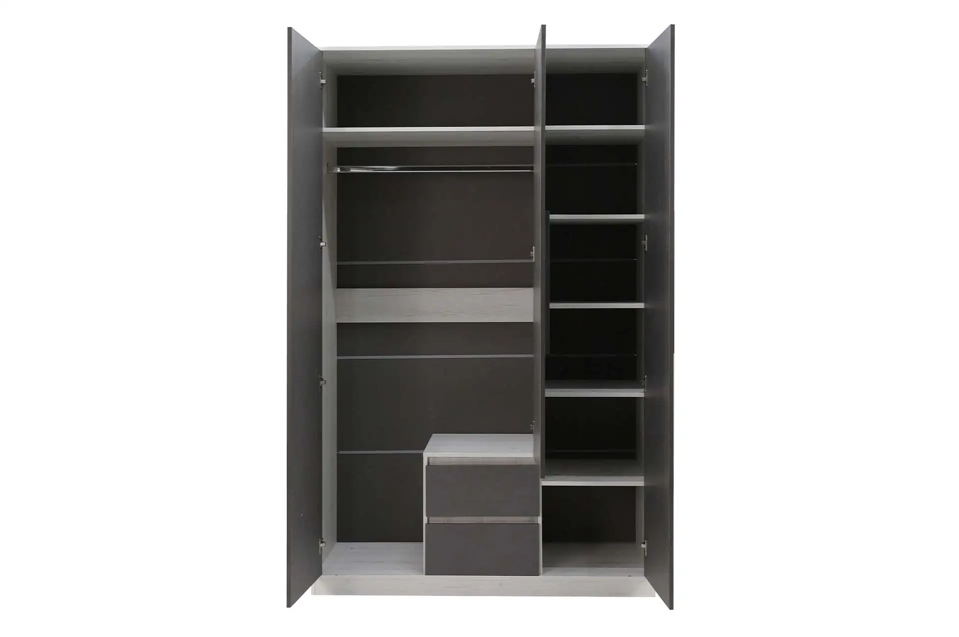 Распашной трехстворчатый шкаф оснащен всем необходимым для организации хранения вещей: штангой, полками и выдвижными ящиками. Сочетание современных трендовых фактур, стильный графитовый цвет придают особый шарм интерьеру.