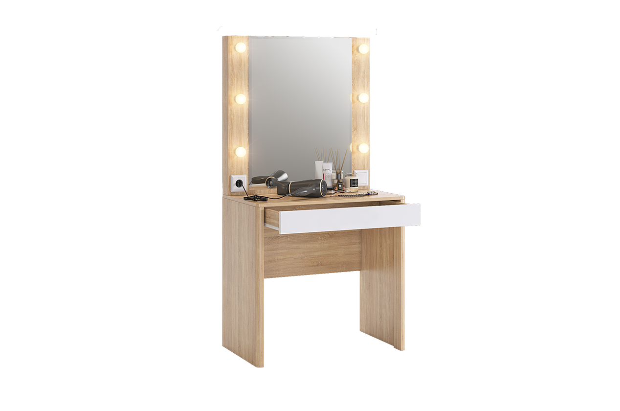Трюмо Зара — это идеальное сочетание стиля и практичности. С широким фацетированным зеркалом, в котором встроена подсветка из 6 лампочек, оно создает атмосферу профессиональных студий визажистов прямо у вас дома. Комфорт и функциональность обеспечиваются дополнительными элементами, такими как выключатель, розетка для фена и выдвижной ящик для хранения украшений и косметики. Элегантные закругленные углы завершают дизайн, делая его идеальным дополнением к вашей спальне.
