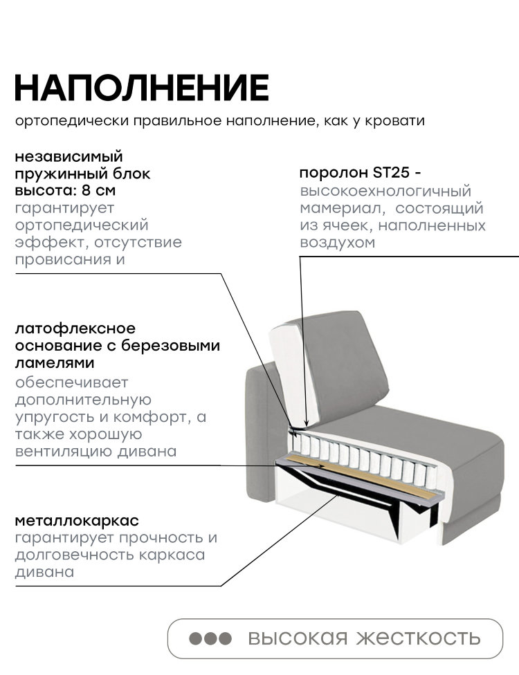 | Подушки дивана | Высокообъемный наполнитель холлофайбер, спонбонд, холлотек, чехлы подушек съемные |